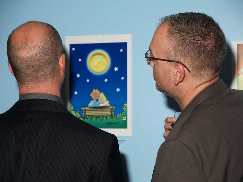 O convite para a primeira turnê européia da mostra partiu da diretora do Programa HIV/Aids e o Mundo do Trabalho, da OIT, Sophia K. Kisting, que se sensibilizou com as "profundas mensagens que elas (as obras) contêm para convencer num contexto de humor". Na Suíça a mostra foi viabilizada pela Federação Internacional de Planejamento Familiar / Região do Hemisfério Ocidental (IPPF/WHR) em parceria com o Programa Conjunto das Nações Unidas sobre HIV/Aids (Unaids).