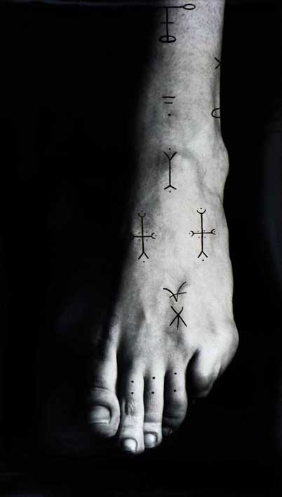 Florence Béchu vit et travaille en France après avoir séjourné et exposé plusieurs années en Italie. Son travail peut se définir comme une réinterprétation de la photographie qu’elle incise, recouvre partiellement de différents matériaux, ou recoud, jusqu’à lui donner un relief proche de la sculpture. Ses séries de scarifications sur dos à la peau noire ou de signes dessinés sur peau blanche à la manière des décorations au henné d’Afrique du nord, procèdent plus du rituel que d’un acte agressif et nous font aborder le domaine du sacré.